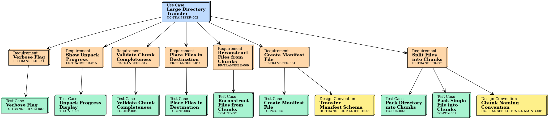 Transfer large directory with mixed file sizes (40GB, 50,000 files) across air-gap preserving structure and permissions. Pack: Archive directory to tar format, split into chunks sized for USB capacity (32GB + 8GB), preserve directory structure and file permissions. Transfer: Transport USB drives across air-gap with optional chain of custody verification. Unpack: Verify chunk checksums, extract in order preserving structure, verify final directory integrity and file count. Acceptance Criteria: All files present, directory structure preserved, file permissions maintained, all checksums verified, process takes < 30 minutes. |